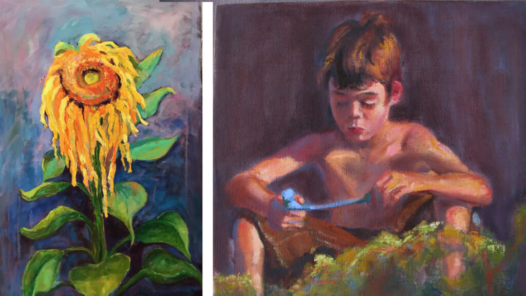 I am a self taught artist and the oldest of the group. I learned my art in California .My daughter and I trekked across the country to come home. It was awesome…the land we saw was beautiful but also stressful….so many cars, so many people.