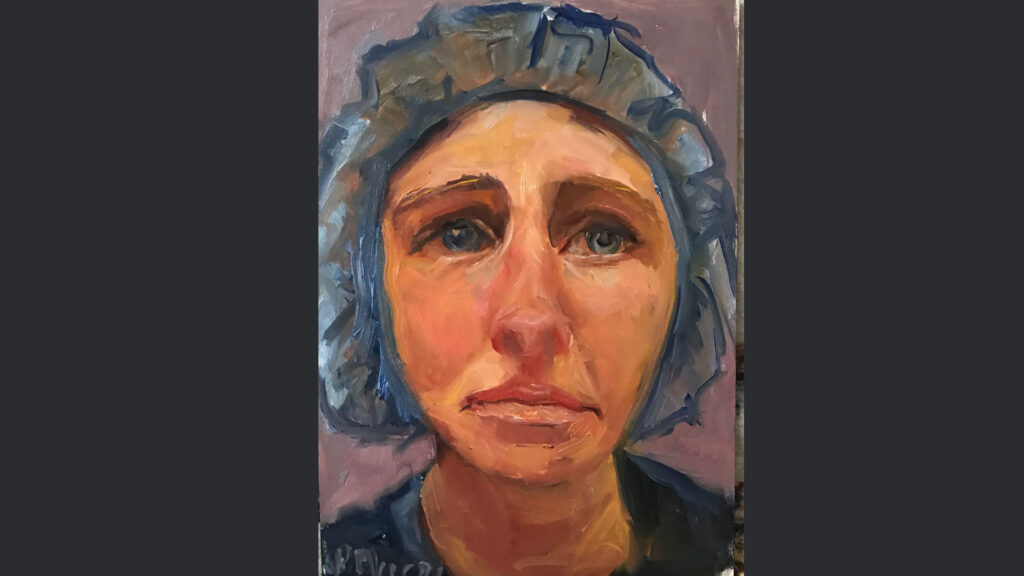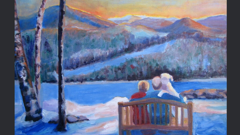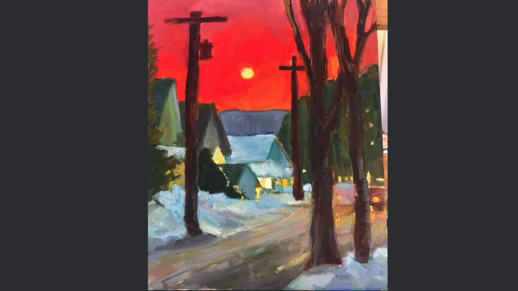 That next spring…COVID! Now we have fear, isolation, loneliness but I still have my family and my art. I talked with birds, and turkeys and deer, a few moose..the paintings were all depressing covid. Slowly it went away and we all came out…….took classes and went to art meetings at Artistree.